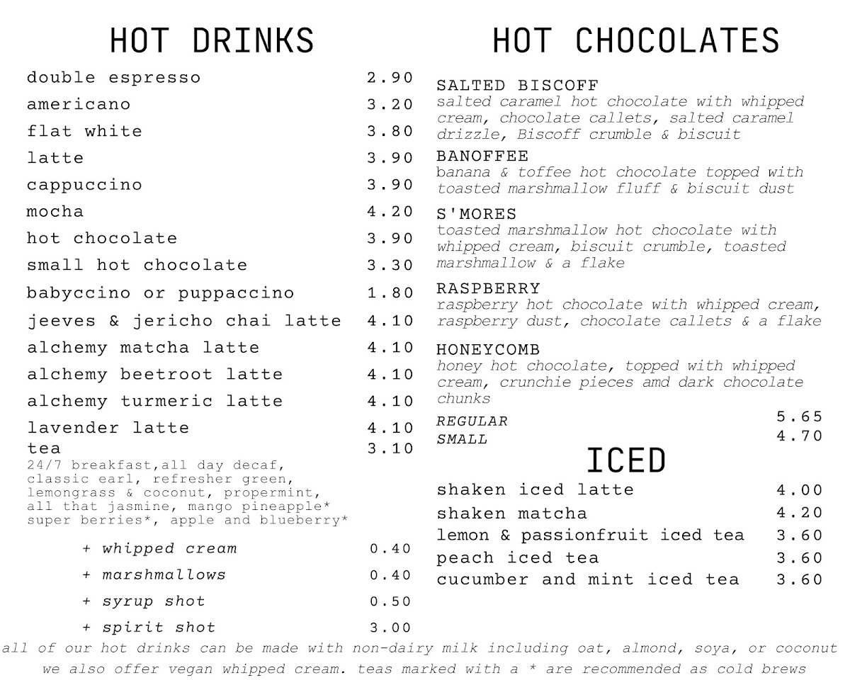 - Refreshing iced drinks, including shaken iced lattes (£4.00) and unique lemon & passionfruit iced tea (£3.60)